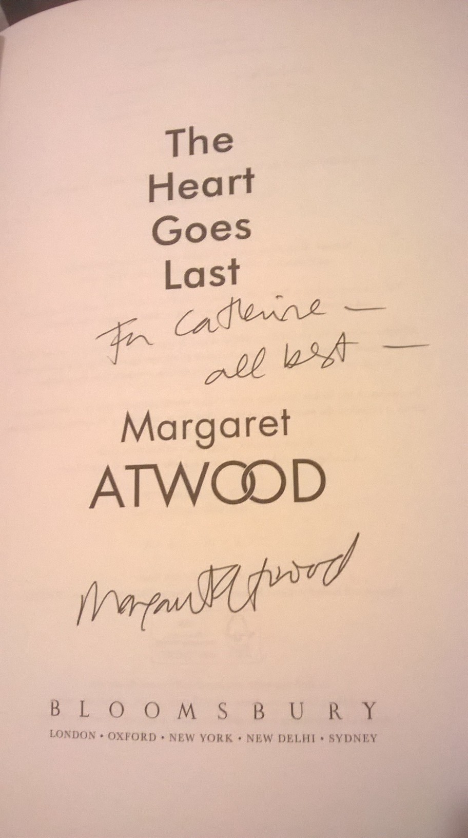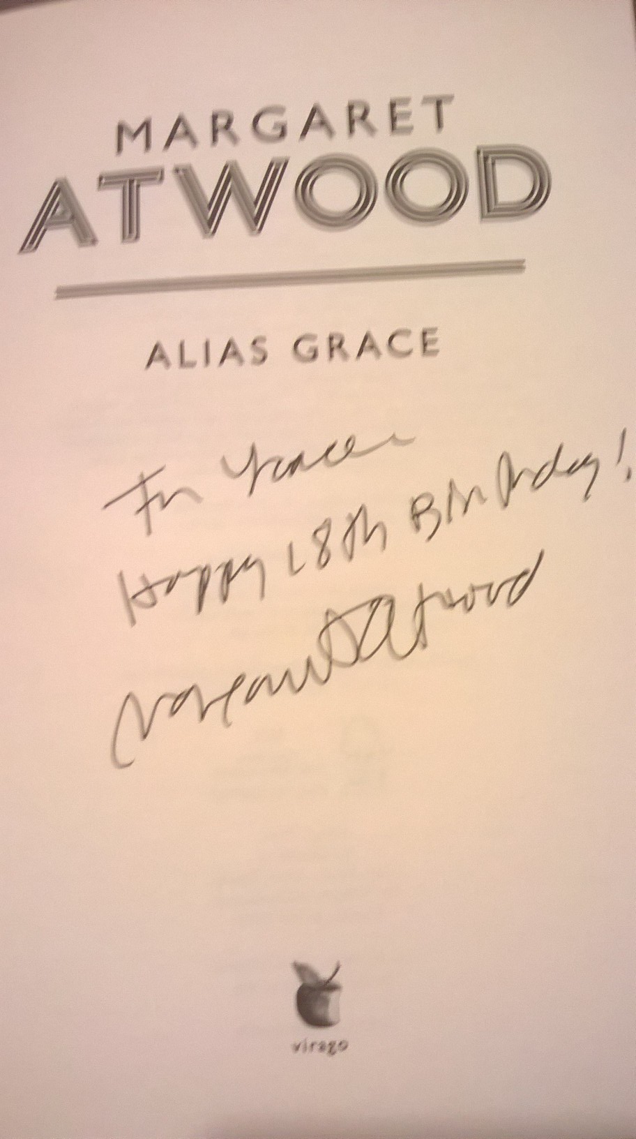 If it wasn’t for Twitter, I’d never have discovered that Margaret would be touring GB to talk about her new novel, ‘The Heart Goes Last’. So my friend Kate and I went to see her in Nottingham. We each bought a signed copy of the new book. I also bought a brand new copy of ‘Alias Grace’ and plucked up courage (in a rather awestruck, shaky voice) to ask Margaret if she would dedicate it to my daughter. She did so, as you will see. I plan to hand this over on Grace’s birthday. Whether she reads the book or not, it serves as a lovely souvenir of her parents’ inspiration to name her. Not that we supposed she’d ever become as notorious as Grace Marks! (Fingers crossed!)