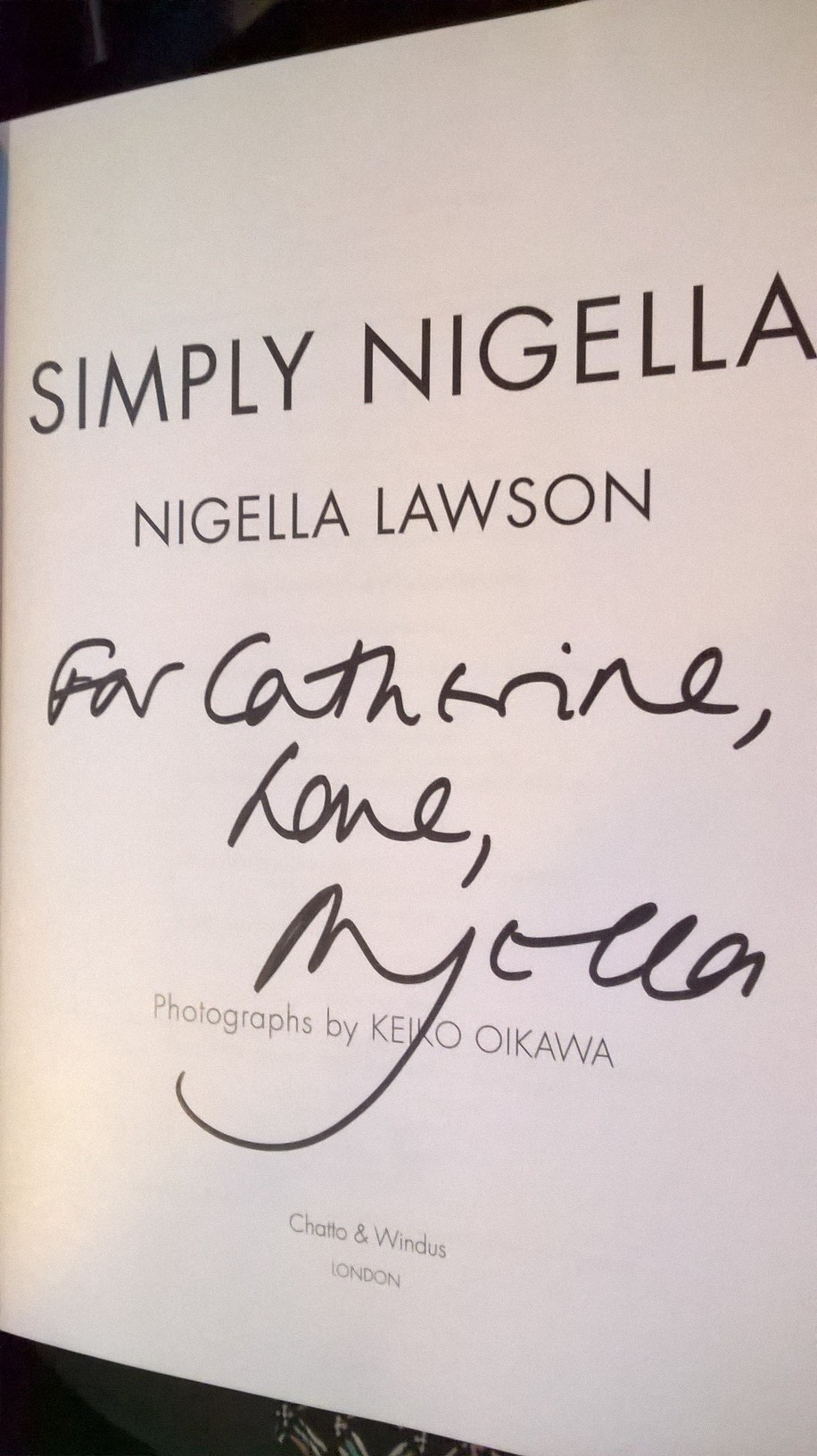 I arrived in store for 3pm and although Nigella was due to arrive for the book signing at 5.30pm, I was not the first! I sat in the cafe on the top floor, with a scone, a pot of tea and her new book, ‘Simply Nigella’. At around 4pm, staff began to set out a table and chair for Nigella and the queue started to form. I joined it. Whilst waiting, I chatted to one or two like-minded devotees. We discussed our favourite recipes and our plans for which of the new ones we’d make first. Being a liquorice lover, I will initially head to page 280 to try the Liquorice and Blackcurant cake and then to page 336 for the Blackcurrant and Liquoruce ice-cream.